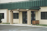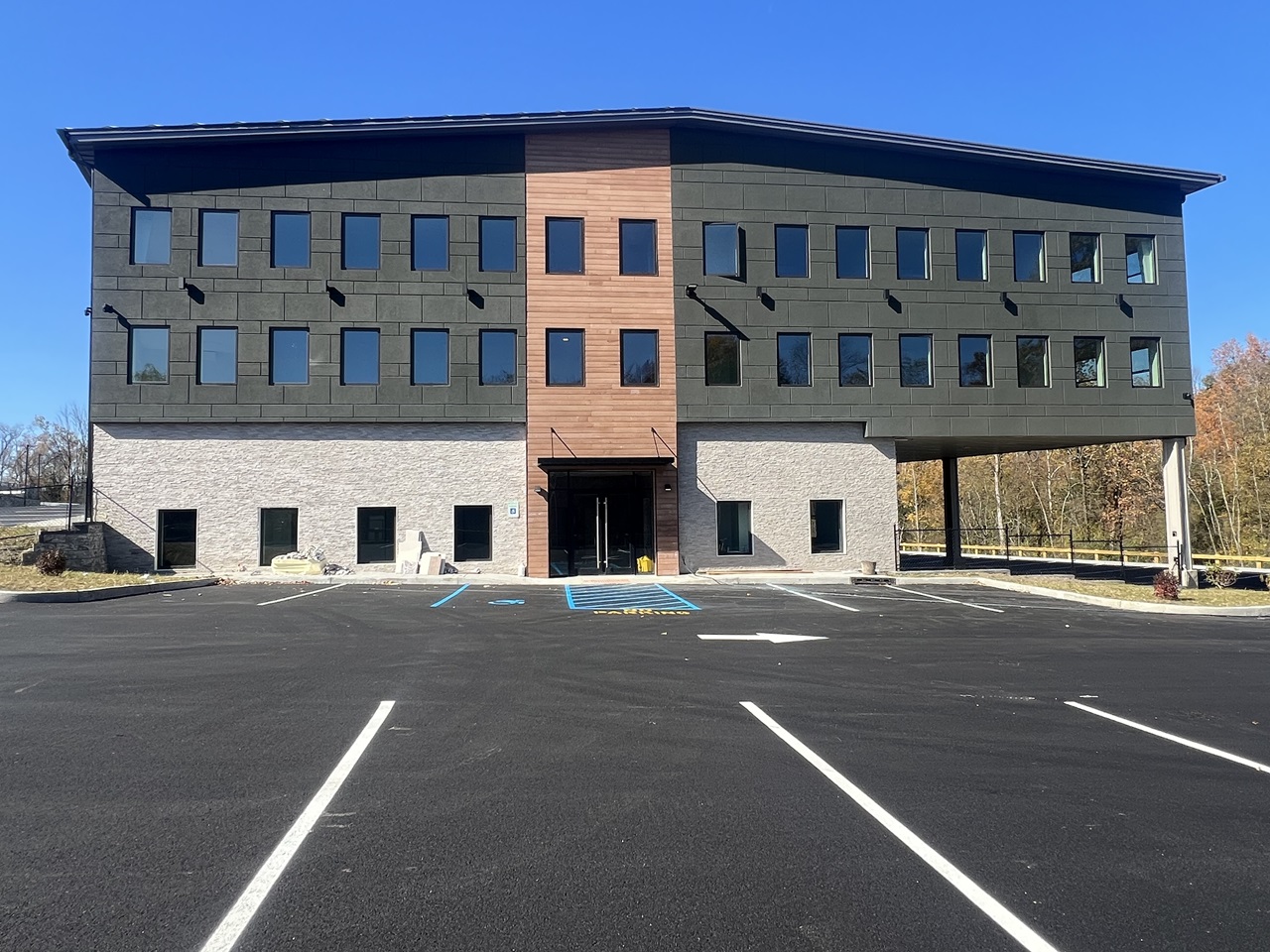 exterior wall system at the front entrance and a metal roof system.